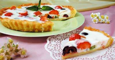 Смешайте муку, соду и соль, добавьте яйцо, маргарин и протёртый творог. Замесите тесто, скатайте в шар, заверните в полиэтиленовую пленку и выдержите в холодильнике 1 час. Раскатайте тесто, вырежьте в виде круга и выложите в смазанную маслом форму, плотно прижав по всей поверхности. На дно постелите пергаментную бумагу, насыпьте фасоль или сухой горох для сохранения формы пирога. Выпекайте в духовке 20 минут при 200 С. Уберите фасоль и бумагу и выпекайте ещё 10 минут. Охладите. Замочите желатин в холодной кипяченой воде. Как только крупинки станут прозрачными, слейте лишнюю воду и растопите его на водяной бане. Затем тонкой струйкой введите в йогурт и хорошо перемешайте. Поверх готового коржа уложите фрукты и ягоды и залейте йогуртовой смесью. Охладите до полного застудневания.
