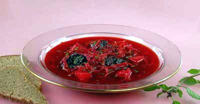 Грибы замочите в 5-кратном количестве воды на 3-4 часа. Свеклу нарежьте соломкой, слегка обжарьте на части масла, добавьте уксус, томатную пасту, сахар, немного воды и тушите до готовности. Морковь и лук нарежьте соломкой и обжарьте на оставшемся масле. Грибной настой процедите, влейте воду, добавьте нарезанные соломкой грибы, доведите до кипения. Затем положите нарезанный кубиками картофель, нашинкованную соломкой капусту, варите суп 10 минут. Добавьте распаренный чернослив, тушеную свеклу, мелко нарезанный корень петрушки и пассерованные овощи. Варите суп еще 15 минут. За 5 минут до готовности посолите, поперчите, добавьте перец горошком.