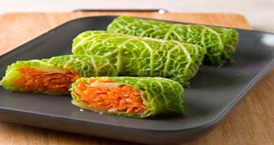 Кочан разберите на листья, слегка их отбейте. Морковь натрите на крупной терке, добавьте измельченный чеснок. Капустные листья опустите в кипящую подсоленную воду на 2-3 минуты, затем обдайте их холодной водой. На капустные листья уложите морковь и плотно сверните их рулетиками. Для рассола воду доведите до кипения, посолите и варите до растворения соли. Рулетики уложите вплотную друг к другу, залейте рассолом так, чтобы он едва покрывал их. Выдержите закуску под гнетом в холодном месте 2-3 дня.