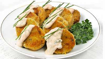 Картофель и морковь сварите по отдельности, протрите горячими и соедините. Грибы и лук мелко нарежьте, обжарьте в части масла сначала лук, затем добавьте грибы и жарьте всё вместе. Смешайте протёртые овощи и грибы с луком, добавьте соль, яйцо и мускатный орех, хорошо перемешайте. Из массы сформуйте небольшие лепешки, запанируйте их в сухарях и обжарьте на оставшемся масле до образования золотистой корочки. Смешайте ингредиенты соуса. При подаче разложите лепешки на блюдо, сверху положите понемногу соуса и оформите зеленью.