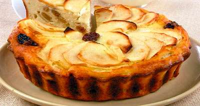 Яблоки очистить, нарезать тонкими дольками, смешать с сахаром, лимонным соком, цедрой и изюмом. Оставить на 1 час. Желтки растереть с творогом, добавить ванильный сахар, манную крупу, разрыхлитель. Белки взбить с щепоткой соли. 2\3 нормы яблок или других фруктов смешать со взбитыми белками и творожной массой, выложить в смазанную маслом и посыпанную сухарями форму, оформить оставшимися яблоками или другими фруктами. Запекать 30-40 минут при 200 С. Подавать со сметаной.