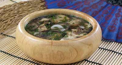 Баклажаны нарежьте ломтиками, сварите на пару, остудите. Подготовленные ломтики баклажанов поперчите, соедините с нашинкованным зеленым луком, нарезанным тонкими ломтиками чесноком, уксусом и соевым соусом. Оставьте на 15-20 минут. Залейте баклажаны горячим куриным бульоном.