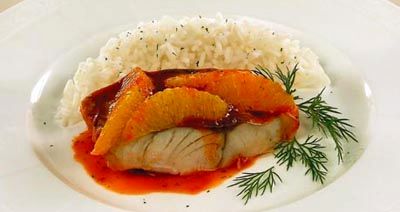 Рыбу нарежьте порционными кусками, апельсин очистите и нарежьте дольками. Ингредиенты блюда соедините, залейте смесью лимонного сока с кетчупом и имбирем. Слегка посолите. Запекайте под крышкой 15 минут при полной мощности. Подавайте с рассыпчатым рисом, оформив зеленью.