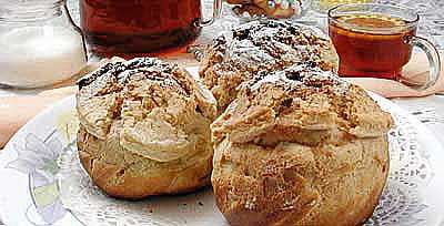 Смешайте все ингредиенты теста. Замесите и поместите в холодильник на час. Разогрейте духовку до 200 С. Слегка смажьте маслом лист. Приготовьте заварное тесто. Положите масло в воду, доведите до кипения, чуть-чуть посолите и при непрерывном помешивании всыпьте муку. Проварите 2-3 минуты, охладите и добавьте яйца. Хорошо взбейте. Разложите в виде шариков на противень. Не кладите слишком тесно. Достаньте тесто из холодильника и раскатайте до толщины 3 мм. Вырежьте круги диаметром 6 см. Положите по кругу на каждый шарик. Выпекайте в нижней части духовки в течение 20-30 минут, пока пышки не подрумянятся и не поднимутся. Первые 10 минут не открывайте духовку. Охладите. Для наполнителя смешайте яичные желтки, по 3 чайные ложки сахара, муки и 200 грамм сливок. Варите, непрерывно взбивая, пока смесь не загустеет. Охладите. Добавьте ванильный сахар. Взбейте ещё 100 грамм сливок и добавьте к смеси. Сделайте небольшие полости в основании и заполните их сливочной смесью. Сверху посыпьте сахарной пудрой.