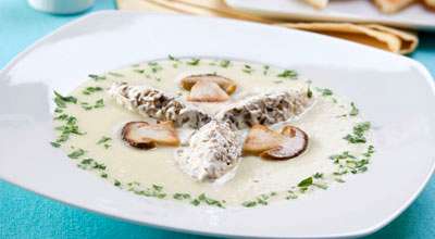 Для грибного мусса грибы нарежьте ломтиками, несколько штук отложите для оформления, остальные мелко порубите и обжаривайте на оливковом масле 5 минут. Взбейте 100 грамм сливок, смешайте с жареными грибами.