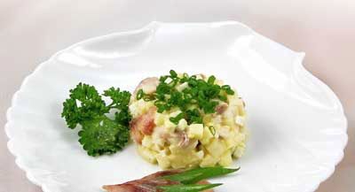 Филе сельди нарежьте тонкими ломтиками. Очищенные яблоки, картофель и репчатый лук нарежьте мелкими кубиками. Яйца мелко порубите. Соедините подготовленные продукты и полейте заправкой. Для заправки масло смешайте с уксусом, добавьте горчицу, соль, перец, сливки и взбейте.