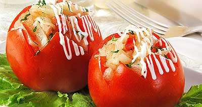 Срезать у каждого помидора верхушку и чайной ложкой удалить семена с частью мякоти. Ананас очистить от кожицы, мякоть нарезать кружочками, удалить сердцевину. Затем мякоть измельчить, соединить с мелко нарезанными мякотью помидоров и зеленью сельдерея, добавить соль, перец. Наполнить полученным фаршем помидоры, полить майонезом и разложить их на блюде, покрытом листьями салата.