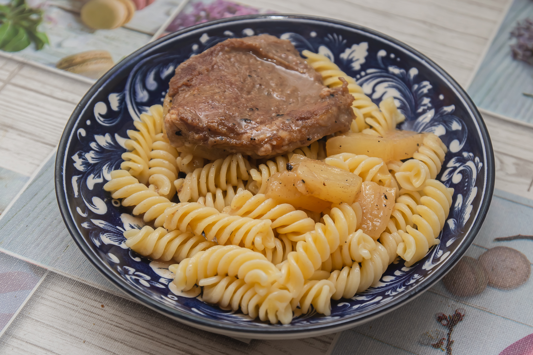 Говядину нарежьте тонкими ломтиками, залейте маринадом и выдержите 30 минут. Кольца ананаса разрежьте на части. Зеленый лук нарежьте кусочками длиной 2-3 см. Маринованные ломтики мяса жарьте на хорошо разогретом масле с двух сторон по 1 минуте.