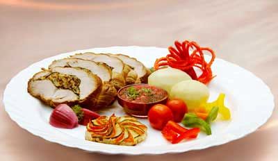 вырезка свиная - 600 гр. шампиньоны - 200 гр. лук репчатый - 1 головка, белый - 1 головка, красный - 1 головка шпинат - 50 гр. масло растительное - 1\2 стакана перец красный молотый, соль по вкусу клюква - 25 гр. вода - 2 ст. ложки сахар - 2 ст. ложки вино красное - 1 ч. ложка кабачки - 100 гр. помидоры - 2 шт. картофель вареный - 4 шт. сухари панировочные - 1 ст. ложка уксус 6%-й - 1 ст. ложка