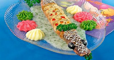 Щуку зафаршировать, завернуть в марлю и варить с добавлением корня петрушки и лука при слабом кипении до готовности. Для соуса муку подсушить, растереть с оставшимся маслом, развести рыбным бульоном - 500 гр., варить 7 минут, а затем заправить лимонным соком и зеленью укропа. При подаче на блюдо налить соус и уложить рыбу. Гарнировать цветным картофельным пюре. Щуку очистить от чешуи, надрезать кожу вокруг головы и снять ее "чулком", оставив хвостовой плавник. Тушку выпотрошить, промыть и отделить мякоть от костей. Батон замочить в молоке, пропустить через мясорубку вместе с мякотью рыбы 2-3 раза. Добавить яйцо, рубленый чеснок, сладкий перец, 2 ст. ложки масла, зелень, соль и молотый перец. Массу взбить и наполнить ею кожу щуки.