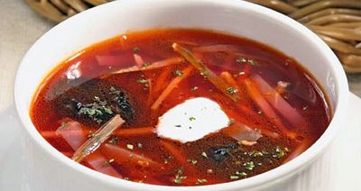 Грибы залейте 15 гр. холодной воды и оставьте для набухания на 2-3 часа. Затем в этой же воде грибы отварите, отвар процедите, грибы нарежьте соломкой и все вместе добавьте в борщ за 15 минут до готовности. Свеклу нарежьте соломкой, прогрейте в жире, добавьте сахар, пассерованный томат, бульон, немного уксуса и тушите до готовности свеклы. Морковь и лук нарежьте соломкой, спассеруйте. Нашинкуйте капусту и положите в кипящий бульон, варите 10-15 минут. Добавьте тушеную свеклу, пассерованные овощи и варите до готовности. За 10 минут до окончания варки добавьте соль, сахар, специи, грибы вместе с отваром. Чернослив отварите. Отвар добавьте в борщ, а чернослив положите в борщ при подаче. Подавайте со сметаной, посыпьте рубленой зеленью.