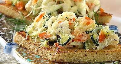 Яблоки, кабачок, морковь и зелень очень мелко нарезать. Цветную капусту разобрать на мелкие кочешки. Морковь потушить с маслом и частью молока до полуготовности, затем положить капусту и кабачок, тушить ещё 10 минут. Охладить. Добавить яблоки, часть сахара, зелень, взбитые яичные белки, посолить. Ломтики хлеба смочить в смеси молока, яичных желтков, сахара и слегка обжарить. На гренки горкой положить тушёные овощи и яблоки, посыпать тёртым сыром и запечь в духовке до золотистой корочки.
