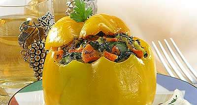 Стручки перца промыть, отрезать верхнюю часть, удалить семена и перегородки. Ошпарить кипящей водой и охладить. Для начинки кабачки и морковь мелко нарезать и обжарить в масле, затем тушить до готовности. Добавить соль, молотый перец, муку, зелень, молоко, мак, прогреть до загустения, слегка охладить и ввести яйца. Каждый стручок перца наполнить начинкой, прикрыть срезанной верхушкой, уложить в жаровню, смазанную маслом, и запечь в духовке. Сметану смешать с аджикой, вылить на блюдо, сверху поставить фаршированный перец острым концом вверх.