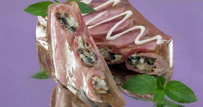Желатин замочить в холодной кипяченой воде, затем откинуть на сито и дать стечь воде. Набухший желатин соединить с теплым бульоном, довести до кипения и охладить. Обжарить грибы. Мелко измельчить вместе с вареными яйцами и чесноком. Перемешать и заправить майонезом. Разложить массу на тонкие ломтики ветчины и свернуть трубочками. Трубочки уложить в форму, залить желе и охладить до застудневания.
