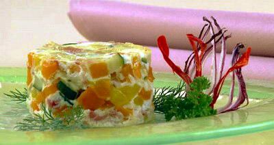 Бекон, лук, сладкий перец и цуккини и нарежьте мелкими кубиками. Бекон обжарьте на масле, добавьте овощи, мускатный орех, лимонный сок, посолите, поперчите и жарьте все вместе еще несколько минут. Яйца слегка взбейте, добавив немного воды, залейте ими овощи и запекайте яичницу в духовке до готовности.