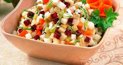 При подаче посыпьте винегрет рубленым зелёным луком, оформите морковью и зеленью.