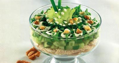 Филе курицы нарежьте соломкой, огурец кубиками, лук измельчите. Уложите в бокалы слоями курицу, огурец и лук. Перед подачей полейте майонезом, посыпьте орехами и оформите зеленью.