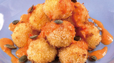 Готовим шарики: Из мякоти тыквы выемкой вырежьте шарики диаметром 2 см, отварите их до полуготовности в подсоленной воде, затем влейте горячее молоко, поперчите и варите до готовности. Готовые шарики откиньте на дуршлаг, обсушите, выложив на салфетку. Запанируйте шарики в муке, в яйце, затем в сухарях. Уложите шарики на противень и, положив на каждый по кусочку масла, запекайте их при 240 С до образования румяной корочки.