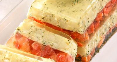 Картофель нарежьте кубиками. Лук мелко порубите, слегка обжарьте, смешайте с картофелем и уксусом. Желатин замочите в холодной кипяченой воде и дайте набухнуть. Затем распустите его в горячем бульоне. Сыр, хрен, сметану, горчицу, рубленый укроп измельчите в миксере, добавьте половину растворенного желатина, перемешайте и соедините с картофелем. Филе лосося нарежьте кубиками. В форму уложите слоями картофель и филе лосося. Верхний слой украсьте укропом и залейте оставшимся желе. Достаньте заливное из формы и нарежьте ломтиками.