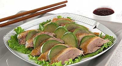 Кожицу утиной грудки проткните в нескольких местах вилкой. Смажьте грудку смесью взбитого яйца и соевого соуса, посолите и поперчите. Подготовленную грудку выложите на решетку, запеките в духовке в течение 15-20 минут при 220 С до образования золотистой корочки и нарежьте ломтиками. Авокадо очистите от кожицы, удалите косточку, мякоть нарежьте ломтиками. Для соуса смешайте масло, уксус, мед, варенье и соль. Блюдо выстелите листьями салата, сверху выложите ломтики утки и авокадо. Соус подайте отдельно.
