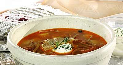 Говядину залейте холодной водой и доведите до кипения, варите 30 минут на слабом огне, затем положите свинину и продолжайте варить до готовности. Готовое мясо охладите, нарежьте соломкой и разложите по горшочкам, залейте горячим бульоном. Огурцы нарежьте соломкой, лук - полукольцами, добавьте томат-пюре и все это обжарьте на масле. Затем разложите поровну в горшочки с мясом и бульоном, положите картофель, очищенный и нарезанный кубиками, соль, перец горошком, лавровый лист и поставьте в разогретую до 160 С духовку на 20-25 минут. Подавайте солянку в горшочках, сверху положите ломтик лимона, заправьте сметаной и оформите зеленью.