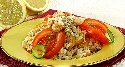 Рис переберите, промойте, сварите в подсоленной воде до готовности и откиньте на дуршлаг. Накройте крышкой и поставьте в теплое место. Лук и чеснок мелко порубите, сладкий перец нарежьте колечками. Подготовленные овощи обжарьте на разогретом масле. Добавьте нарезанную кубиками куриную мякоть, посолите, поперчите и продолжите обжаривание. Положите рис и креветок, приправьте сахаром, лимонным соком и жарьте еще 3-5 минут. При подаче оформите блюдо ломтиками огурца, помидора. Сверху посыпьте молотыми орехами.