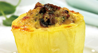 Очищенные кабачки разрежьте вдоль на половинки, удалите часть мякоти с семенами. Затем половинки кабачков припускайте 20 минут в 2-х стаканах подсоленной воды. Грибы варите 30 минут в 2-х стаканах воды, затем воду слейте, а грибы охладите и порубите. Лук нарежьте мелкими кубиками и обжаривайте на масле 5 минут, добавьте грибы и продолжайте жаренье ещё 7 минут. Для начинки смешайте рис, обжаренные грибы и лук, добавьте рубленую зелень, специи и перемешайте. Наполните половинки кабачков приготовленной начинкой, залейте смесью сметаны и яйца и запекайте 15 минут.