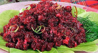 Очищенную свёклу нарежьте соломкой, залейте водой так, чтобы она слегка её покрывала. Варите 3-5 минут, настаивайте без нагревания под крышкой 8-10 минут. Охлажденную свёклу пропустите через мясорубку вместе с сыром и очищенным луком. В полученную массу добавьте мелко рубленный чеснок, растительное масло, соль, перец. Все тщательно перемешайте.