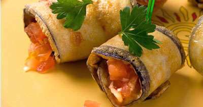 Баклажаны нарезаем тонкими длинными ломтиками. Солим и оставляем на несколько минут. Для начинки помидоры нарезаем мелкими кубиками, добавляем истолчённый чеснок. Перемешиваем. Яйца разбиваем в миску и хорошо перемешиваем. Каждый ломтик баклажана сначала обваливаем с двух сторон в муке, затем обмакиваем в яйца и жарим на растительном масле с двух сторон. На край жареного ломтика баклажана выкладываем чайную ложку начинки. Сворачиваем ломтик с начинкой рулетиком, который закрепляем шпажкой или зубочисткой. Рулетики из баклажанов хороши как в горячем, так и в холодном виде.