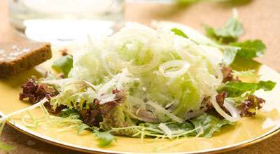 Редьку и огурцы очистить от кожицы, натереть на крупной тёрке, смешать, посолить. Листья салата промыть, встряхнуть, нарвать руками и уложить в салатник. Тёртую редьку и огурцы отжать и выложить поверх салатных листьев. Лук очистить, нарезать кольцами, посыпать ими салат. Полить его смесью оливкового и подсолнечного масел, поперчить.