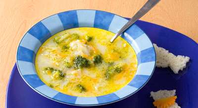 Залейте брокколи кипятком так, чтобы вода едва покрывала соцветия, и варите на слабом огне 5 минут. Морковь и картофель натрите на тёрке и обжарьте, постоянно помешивая, на оливковом масле. Переложите обжаренные овощи в суп и варите ещё около 10 минут. Немного охладите. Постоянно помешивая суп, влейте в него йогурт. Перед подачей посыпьте суп тёртым сыром.