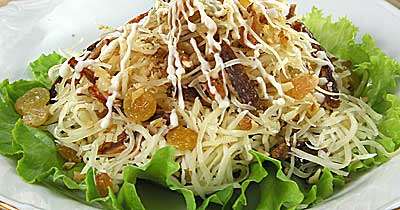 Сыр смешайте с финиками, орехами и изюмом. Заправьте майонезом и перемешайте. Поставьте в холодильник на 1 час. Подавайте на листьях салата.
