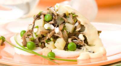 Грибы нарежьте соломкой, обжарьте на масле. Картофель нарежьте мелкими кубиками. Лук мелко порубите. Яйца порежьте кружочками и выложите на тарелку. Картофель соедините с грибами, зелёным горошком, яйцом и луком. Салат выложите горкой на кружочки яиц, полейте майонезом и посыпьте рубленым зелёным луком.