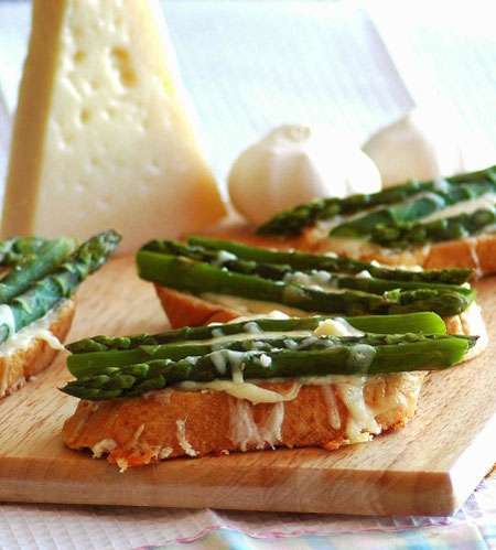 Соединить измельченный зелёный лук, мелко нарезанную спаржу и измельченный чеснок. Добавить лимонный сок и оливковое масло. Перемешать. Запечь на гриле в течение 5-6 минут. Подавать в горячем виде, сбрызнув оставшимся маринадом и посыпав тёртым сыром.
