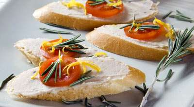 Фасоль и 1 зубчик чеснока измельчите в кухонном комбайне, посолите. Добавьте 4 столовые ложки оливкового масла и смешивайте до получения однородной массы. По желанию можно добавить ещё один зубчик чеснока. Перемешайте. Выложите смесь в глубокую тарелку, добавьте розмарин, цедру лимона, столовую ложку оливкового масла, перемешайте деревянной ложкой, добавьте соль и перец по вкусу. Смажьте пастой ломтики хлеба и оформите их ломтиками помидора и зеленью.