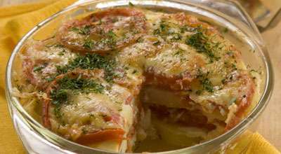 Очищенный картофель нарежьте кружочками и варите в подсоленной воде 5 минут. Помидоры нарежьте кружочками. Яйца взбейте миксером или венчиком, смешайте со сливками, посолите и поперчите. Смажьте маслом ёмкость для запеканки, поочередно выложите в неё слоями кружочки помидоров и картофеля. Полейте яичной смесью. Натрите сыр и посыпьте им сверху овощи. Запекайте блюдо в разогретой до 200 С духовке на нижнем уровне до образования золотистой корочки, примерно 10 минут. Нарежьте мелко зелень и посыпьте ею запеканку перед подачей на стол.
