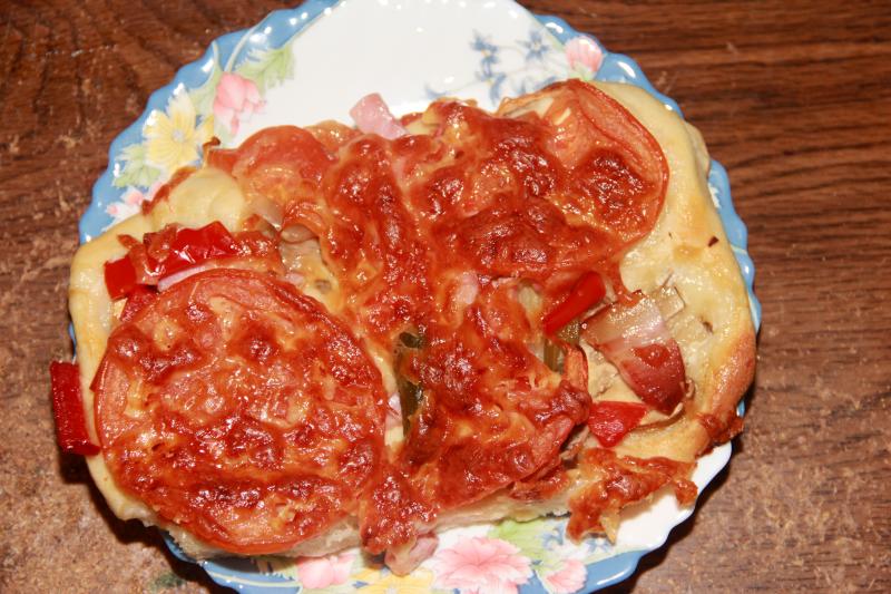 2. Раскатываем тесто на противне как можно тоньше, можно сделать одну большую пиццу, а можно несколько маленьких. Если осталось тесто можно сделать из него булочки.