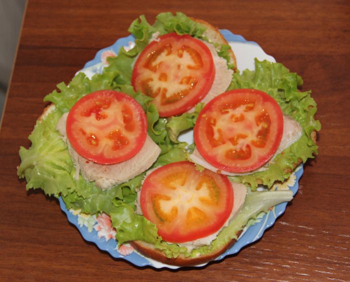 Завершаем бутерброд колечком свежей помидорки.