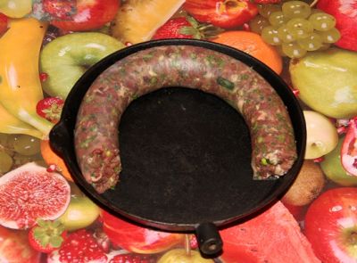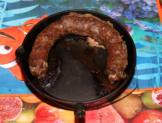 Берем белковую оболочку и начиняем ее фаршем. Набивать плотно не нужно – оболочка при жарке может лопнуть. Выкладываем колбасу на сковородку или в форму для выпекания.