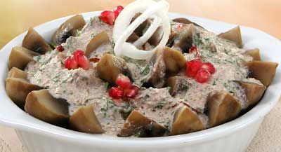 Крупно нарезанные грибы отварить и остудить, бульон процедить. Для орехового соуса пропущенные через мясорубку орехи соединить с грибным бульоном, добавить мелко нашинкованную зелень, измельченный чеснок, нарезанный мелкими дольками перец. Отваренные грибы поместить в фаянсовую или стеклянную посуду, залить соусом, добавить уксус, перемешать.