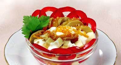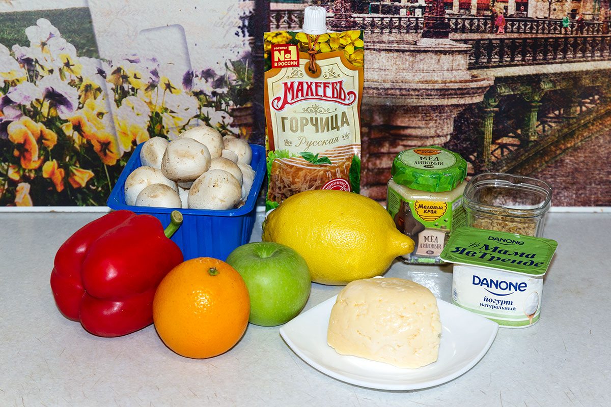 Соедините подготовленные продукты, выложите в салатник и полейте соусом из йогурта, взбитого с горчицей, медом, лимонным соком и цедрой.