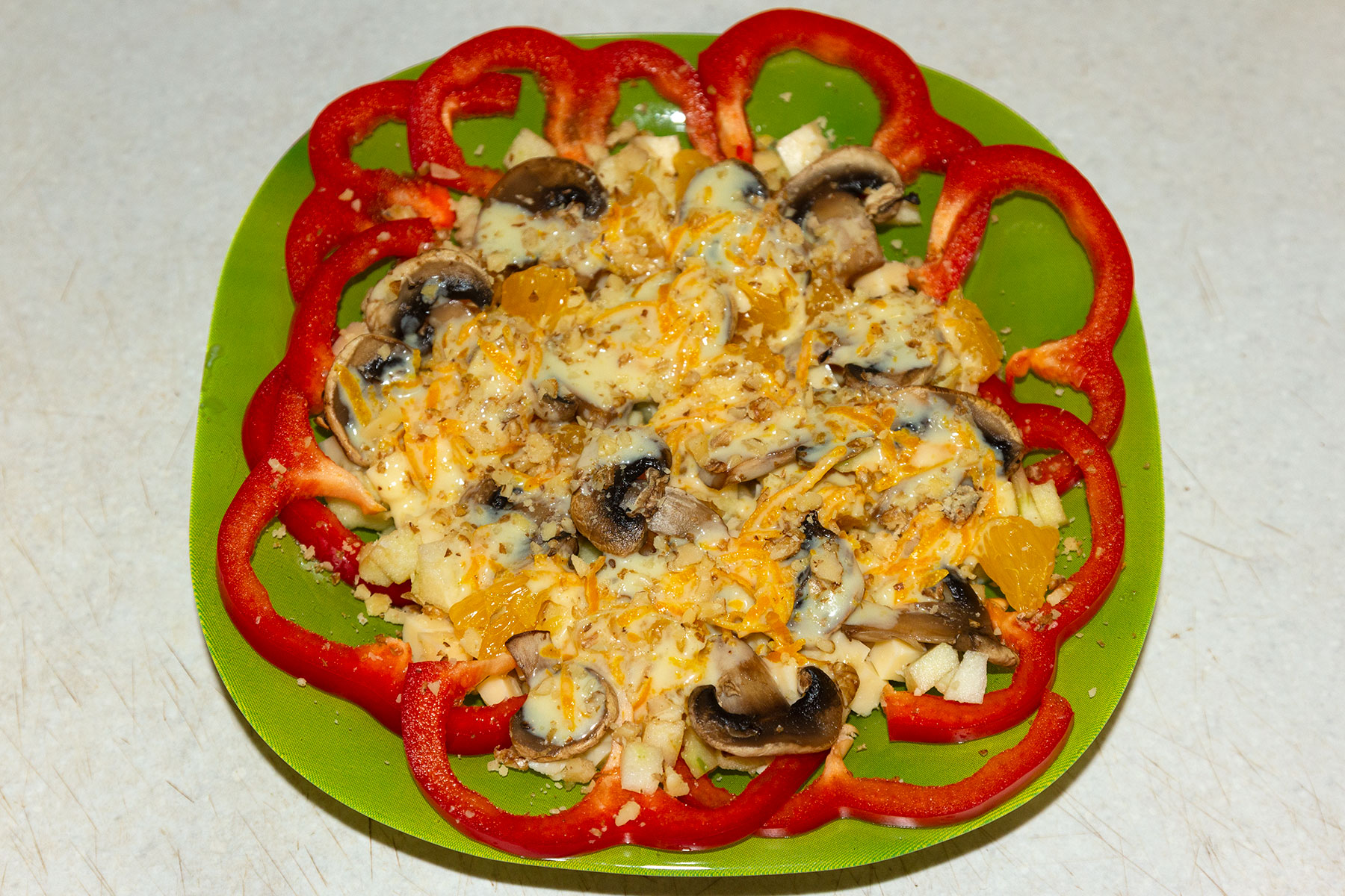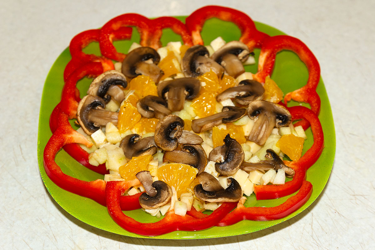Шампиньоны промойте, нарежьте ломтиками, припускайте в собственном соку на среднем огне 15 минут. Охладите.