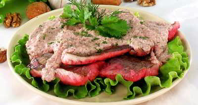 Подготовленное филе нарежьте порционными кусками, уложите в сотейник, посыпьте рублеными луком и зеленью, солью, перцем, залейте смесью вина с 300 гр. воды и отварите в течение 15-20 минут. Готовую рыбу уложите на блюдо. Рыбный бульон процедите, добавьте в него рубленые орехи и чеснок и проварите в течение 10 минут. Залейте рыбу приготовленным соусом.