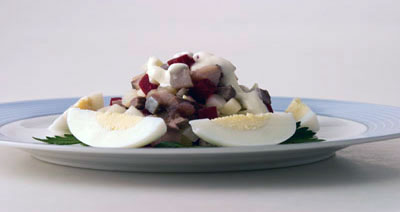 Сельдь разделайте на филе без кожи и костей, вымочите в настое чая или молоке и нарежьте мелкими кусочками. Картофель, маринованную свеклу, соленые огурцы, репчатый лук и яблоки нарежьте кубиками, соедините с нарезанным небольшими кусочками мясом, добавьте немного свекольного маринада, поперчите, перемешайте.