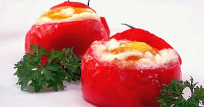 У помидоров срезать верхушку, вынуть мякоть с семенами. Уложить помидоры на противень, в каждый помидор вылить по яйцу, посолить и посыпать измельченной брынзой, сухарями, сверху положить кусочки масла и запекать 10-15 минут при 210 С.