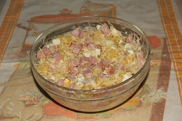 Ветчину, ананас и яйца нарезать кубиками. Сыр натереть на средней терке. Все ингредиенты соединить в салатнике. Перед подачей на стол заправить майонезом.