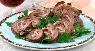 Печень нарежьте ломтиками. Шпик тонко нарежьте и отбейте. лук порубите и обжарьте на масле. Уложите на печень ломтики шпика, пассерованный лук, посолите, поперчите и сверните рулетами. Перевяжите шпагатом и обжарьте на разогретом масле. Зарумянившиеся рулеты выньте и тушите до готовности в небольшом количестве бульона с добавлением корня петрушки и моркови.