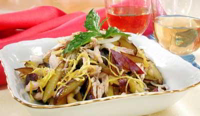 Куриную и утиные грудки отварите в подсоленной кипящей воде 20-25 минут. Охладите, отделите от филе и нарежьте его брусочками. Маринованные сливы разрежьте пополам, удалите косточки, нарежьте соломкой. Цедру нарежьте тонкой соломкой. Лук нарежьте тонкими кольцами, опустите на 1 минуту в кипящую воду. Все ингредиенты перемешайте. Для соуса варенье разотрите с горчицей, добавьте вино, сок лимона, перемешайте, протрите через сито.