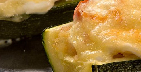 Цуккини разрежьте вдоль пополам, удалите ложечкой часть мякоти с семенами.