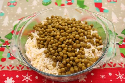С консервированного зеленого горошка слить жидкость и добавить в салатник.
